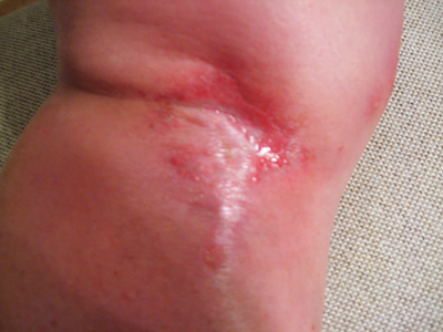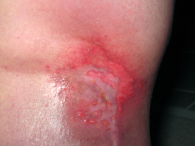 The wounds are particularly painful when they are not covered, and they started oozing blood in addition to fluid on October 23, 2008. (As of 11/3/08, this is still occurring.) |