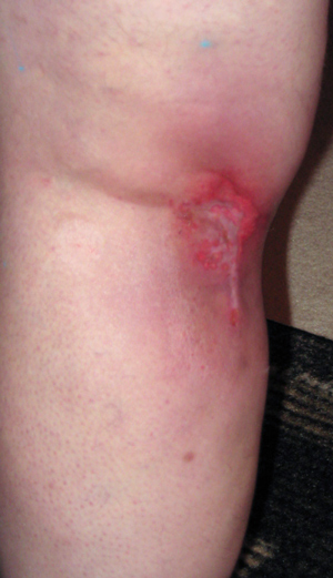 Closeup of crease of knee - 10/26/08 I can't bend or straighten my leg anymore without a LOT of discomfort and/or pain. |