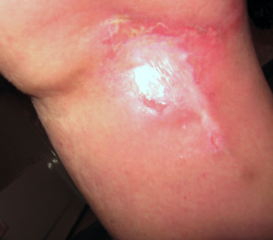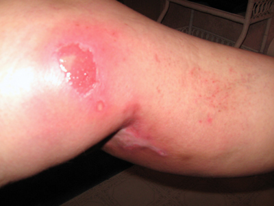 These pictures were taken in the morning; by evening, I wasn't able to bend my knee at all due to swelling. The open wound is spreading towards the smaller one. The wound in the crease of my knee is also spreading. The rash on my upper calf is partially due to radiation-(small itchy blisters and scabs) and my HIVES that are driving me insane and preventing me from getting to sleep at night! |