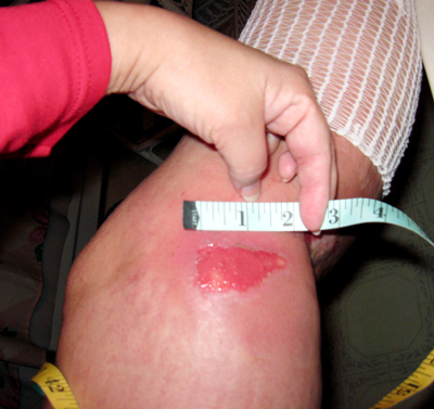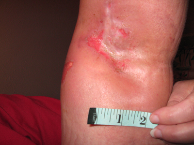 on the side of my leg have joined now. I should mention that allowing these wounds to be exposed to open air like this is extremely painful. Until the evening of Sunday, 11/2/08 I couldn't do this for more than about 1 minute without my leg burning severely and feeling as though the skin around the wounds were "pulling." They also weeped copiously when exposed to the air. From about 10/27 through 11/4, I primarily kept hydrogel dressings on them almost continually (against Emory's advice) because they were the most comfortable dressings I've tried so far. I am still using Xclair cream and my manuka honey, which now burns a LOT when I put it on, but later feels much better than if I just use XClair. I only needed to change the hydrogel dressings about 2-3 times per day as opposed to the honey/Telfa pad dressings that I was changing about twice as often. The Telfa pad dressings were also much more labor intensive to prepare and get uncomfortable as they dry out/bunch up around my knee. |